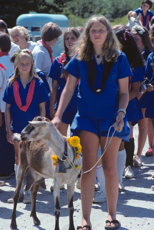 The carved bench was the unofficial boundary between Girls’ Side and Boys’ Side. Most of the girls stayed in cabins, boys in platform tents. Girls wore bloomers (don’t knock ‘em ‘til you try ‘em – very comfy!), matching sailor ‘middies’ and colored silk knotted ties to identify them as camper, apprentice or counselor.